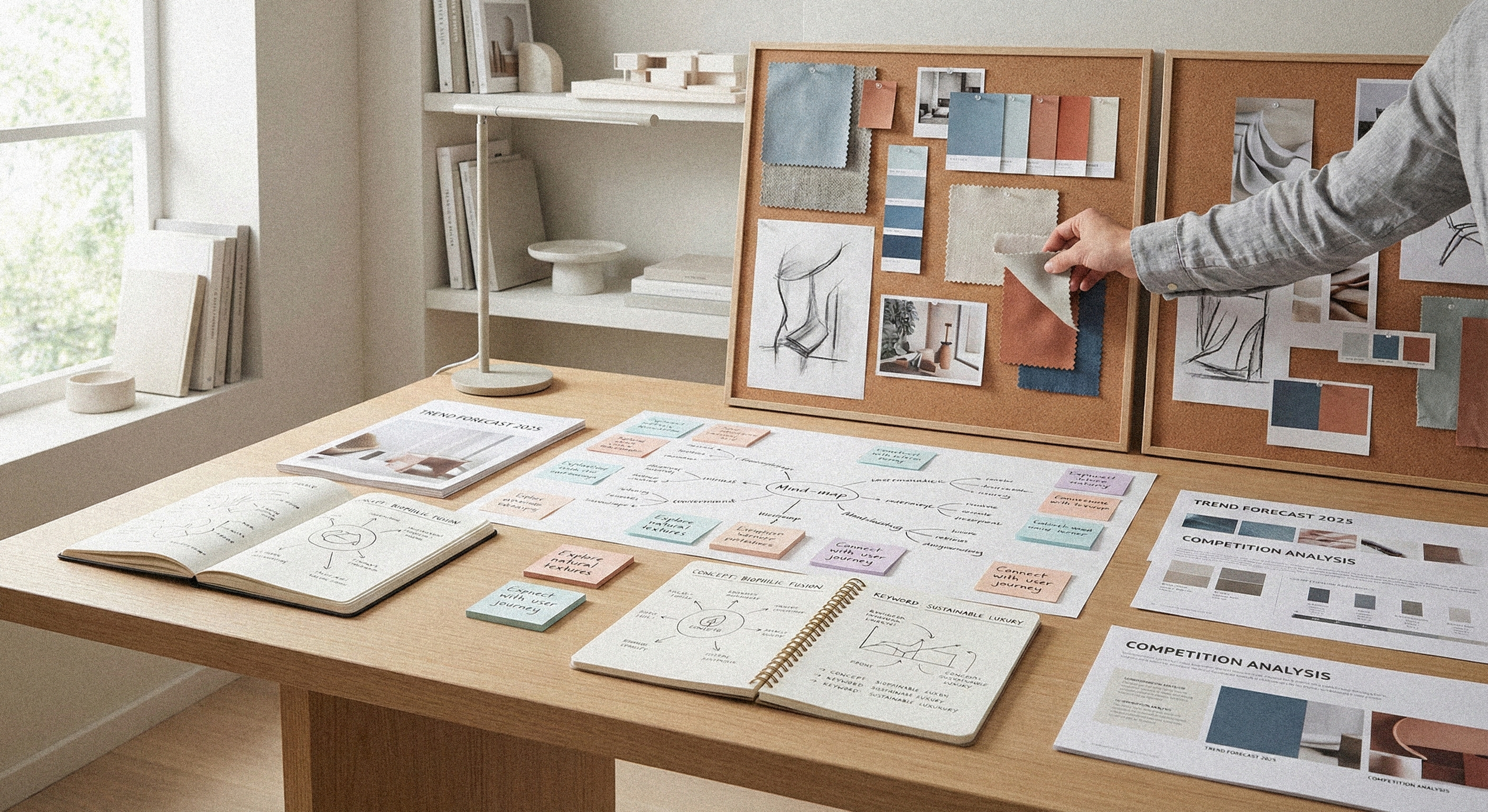 moodboard adapté, analyse des tendances et de la concurrence, recherche de concepts, d’idées directrices.